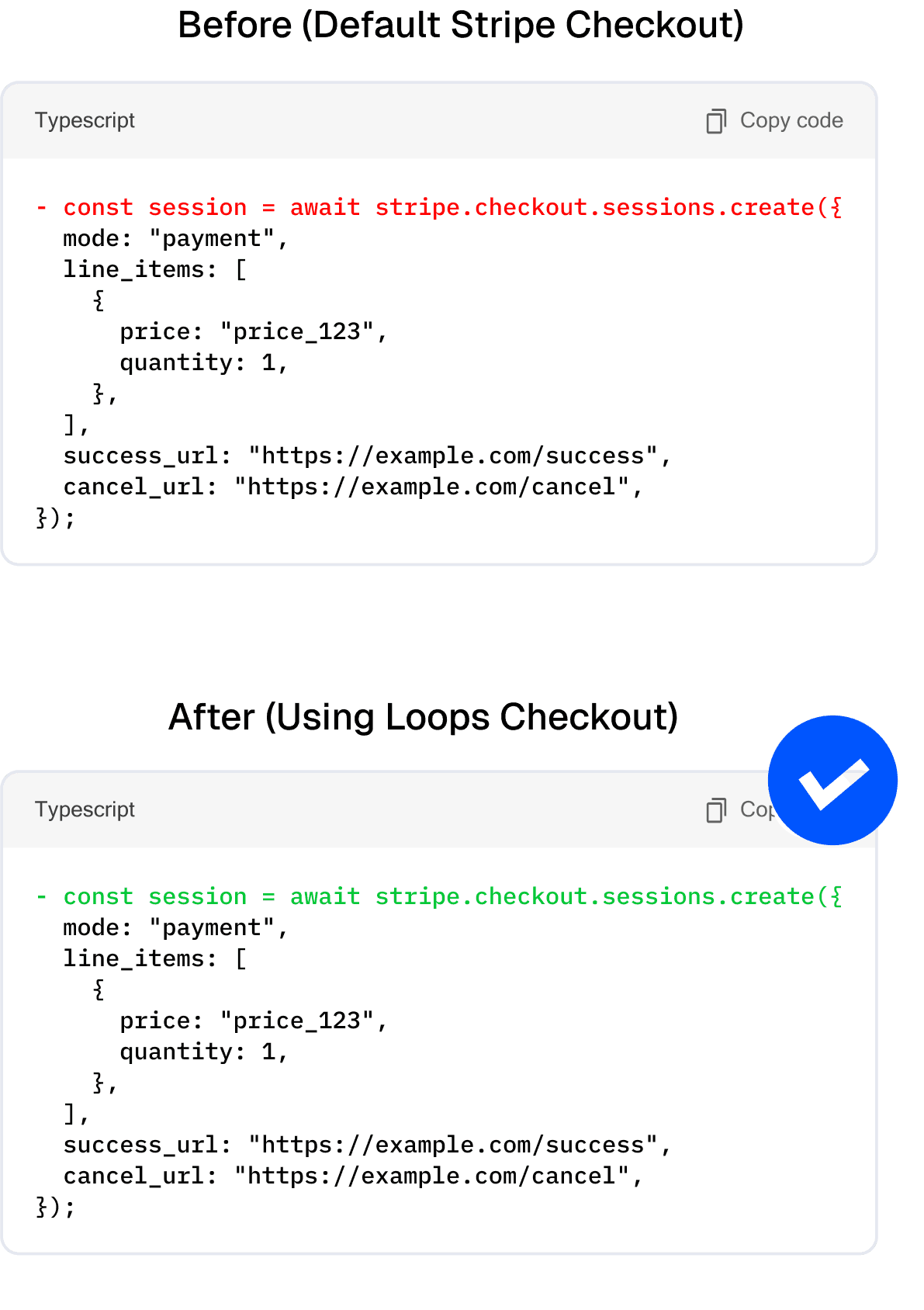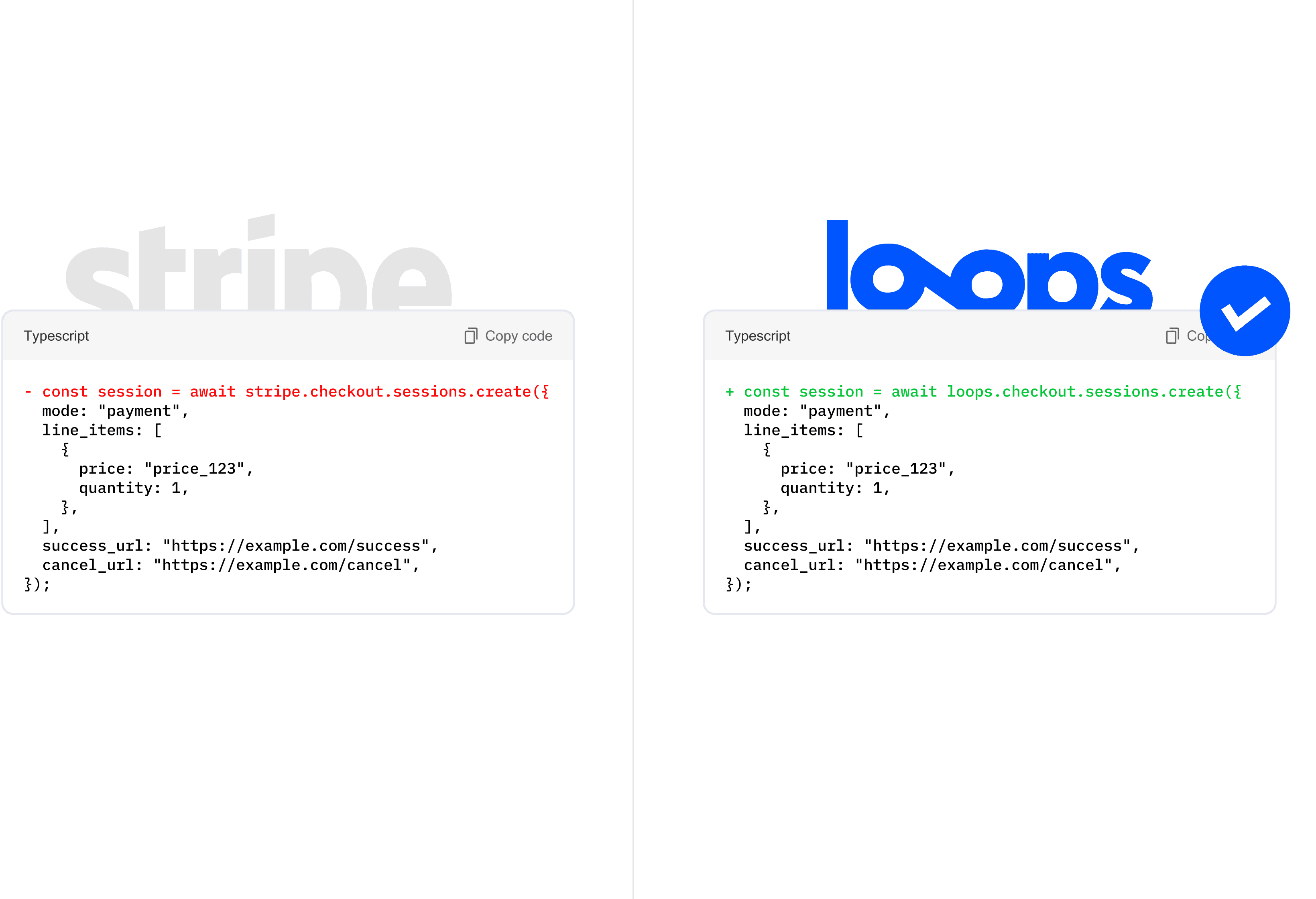 Drop Loops into your app with just one line of code. Stripe stays under the hood, Loops only upgrades checkout.